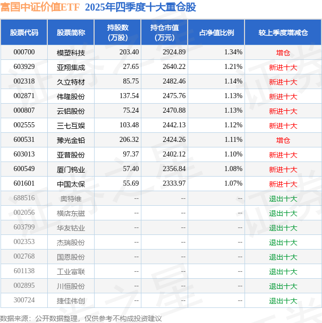 根据2025基金年报公募基金重仓股数据,重仓该股的公募基金共4家,其中持有数量最多的公募基金为富国基金的富国中证价值ETF。富国中证价值ETF目前规模为21.86亿元,最新净值1.2403(1月27日),较上一交易日上涨0.04%,近一年上涨28.46%。该公募基金现任基金经理为曹璐迪 苏华清。曹璐迪在任的基金产品包括:富国中证价值ETF联接A,管理时间为2020年5月20日至今,期间收益率为125.07%;富国创业板ETF,管理时间为2020年8月6日至今,期间收益率为17.82%;富国中证科创创业50ETF,管理时间为2021年6月29日至今,期间收益率为-2.38%。苏华清在任的基金产品包括:富国深证50ETF,管理时间为2023年11月30日至今,期间收益率为48.59%;富国深证50ETF发起式联接A,管理时间为2024年1月23日至今,期间收益率为51.8%;富国中证A50ETF,管理时间为2024年3月7日至今,期间收益率为32.96%;富国中证A50ETF发起式联接A,管理时间为2024年4月23日至今,期间收益率为28.25%。