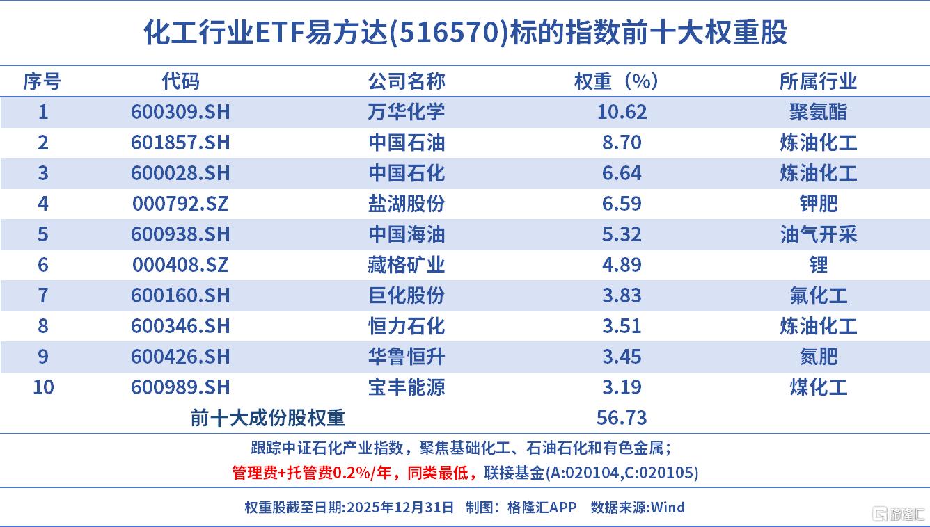 而化工行业ETF易方达(516570,场外联接A/C:020104/020105),跟踪中证石化产业指数,囊括三桶油、万华化学、盐湖股份、藏格矿业、巨化股份、恒力石化等石油石化、基础化工产业龙头公司,受益于反内卷显效下产品涨价预期。