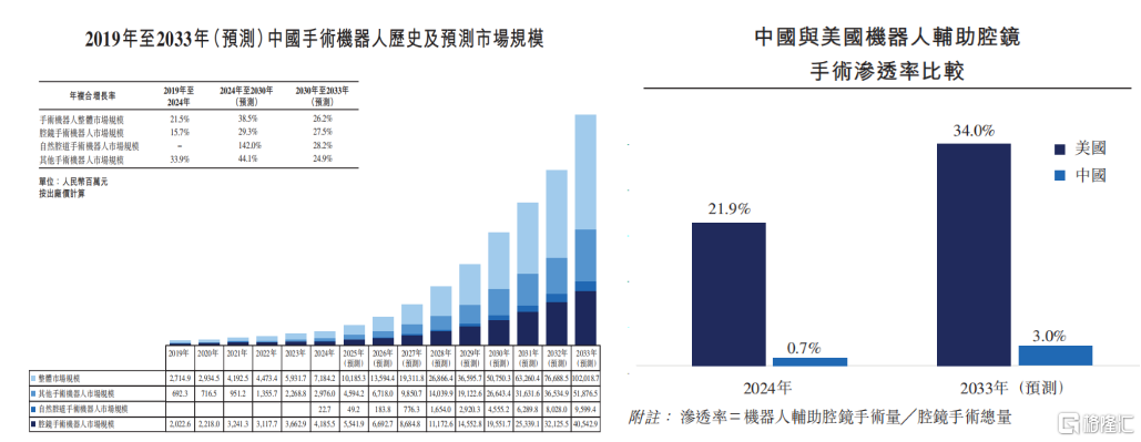 图表一:中国手术机器人市场规模与腹腔镜手术渗透率