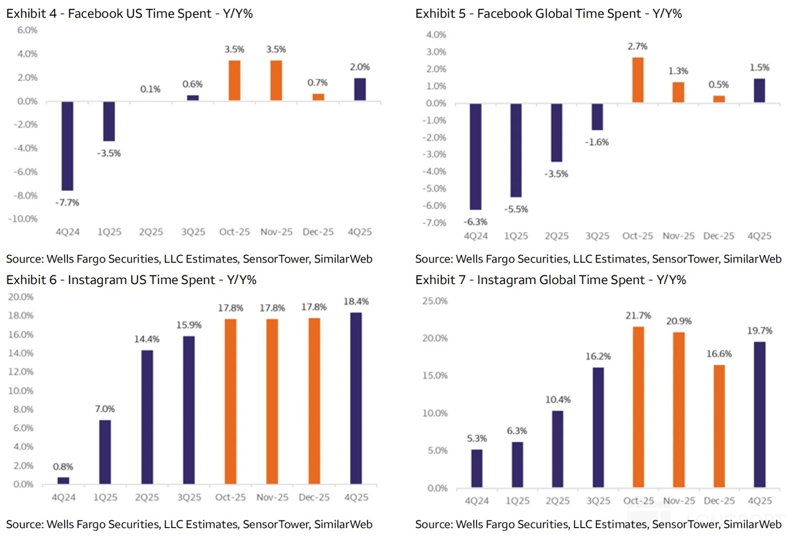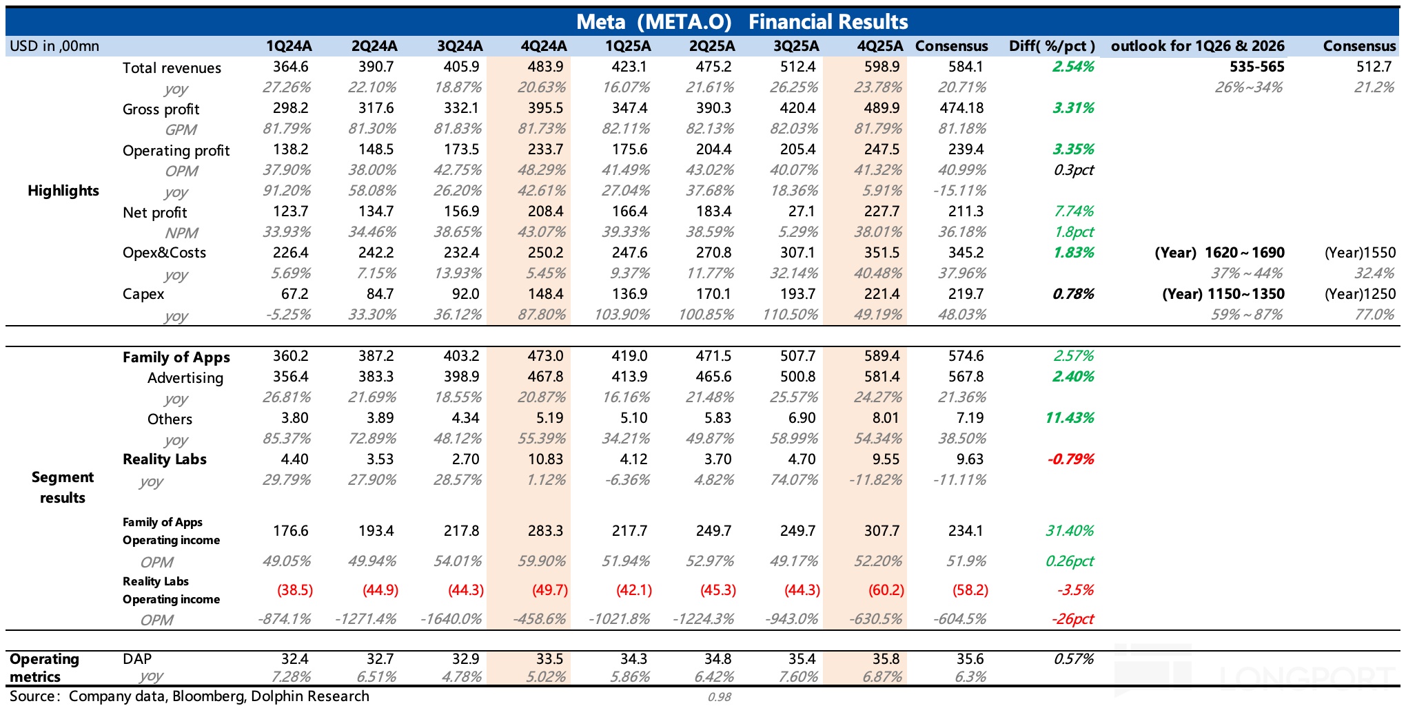 Q1 的收入指引:Meta 管理层预计 1Q26 总营收 535-565 亿区间,对应变动为同比增长 27%~34%,其中汇率有 4 pct 的顺风。这一指引明显高于卖方一致预期 515 亿,从指引趋势上来,按照管理层一贯保守的画风,Q1 增速有望稳在 30% 以上。