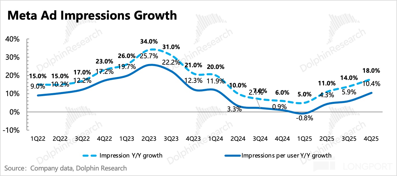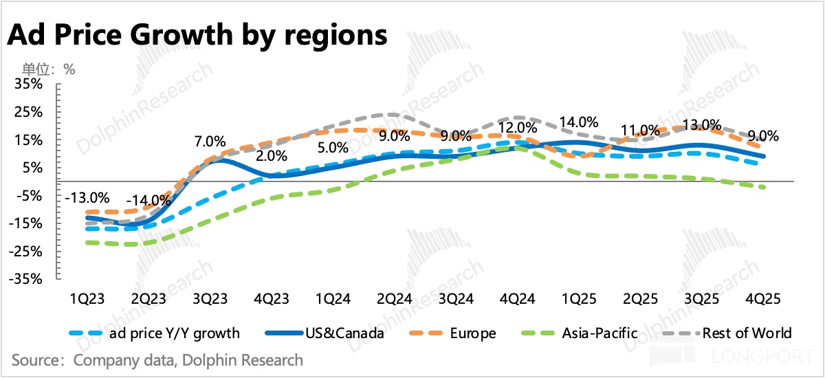 2. 当期表现不错:单看四季度,基本面很扎实,高基数下收入增速还有 24%(汇率中性下增速为 23%),稍高于市场预期。增长的顶梁柱自然还是广告,四季度广告展示量增长 18%,单价增速 6%。