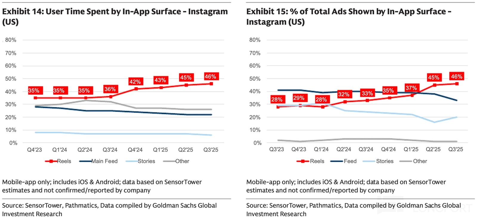 广告强势的驱动力主要就是 Reels 和 AI,从量价变化趋势也能看出,短视频天然增加库存,但单价更低,因此把综合 CPM 的增速拉了下来。在 AI 带来的内容推荐算法优化后,本身就具备沉浸感的 Reels 直接成为脱缰的野马,显著增加了用户粘性和时长,大幅增加广告库存和提高转化效率。