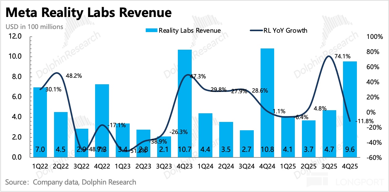 四季度 Reality labs 整体收入 9.6 亿,同比下滑 12%。去年同期 Quest 3S 第一次出货,叠加圣诞,因此创了个销量小高峰。