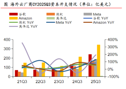 2025年第三季度,北美云厂商资本开支仍然保持加速增长态势,资源高度集中于AI基础设施的部署与建设。谷歌、微软、Meta、亚马逊四大云厂商资本开支合计1133亿美元,同比增长75%,环比增长18%。2026年,算力投资仍将处于上升周期。据机构统计,微软、亚马逊、谷歌、Meta、甲骨文 2026年资本支出将超过 4700 亿美元(较 2025 年同比增长约 26%)。