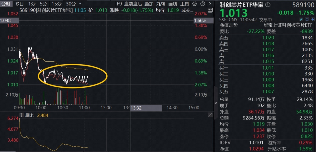 1月29日,芯片赛道短线回调,全“芯”科创芯片ETF华宝(589190)早盘低开后冲高回落,场内价格现跌1.75%,水下区间持续宽幅溢价,显示买盘资金逢跌积极介入