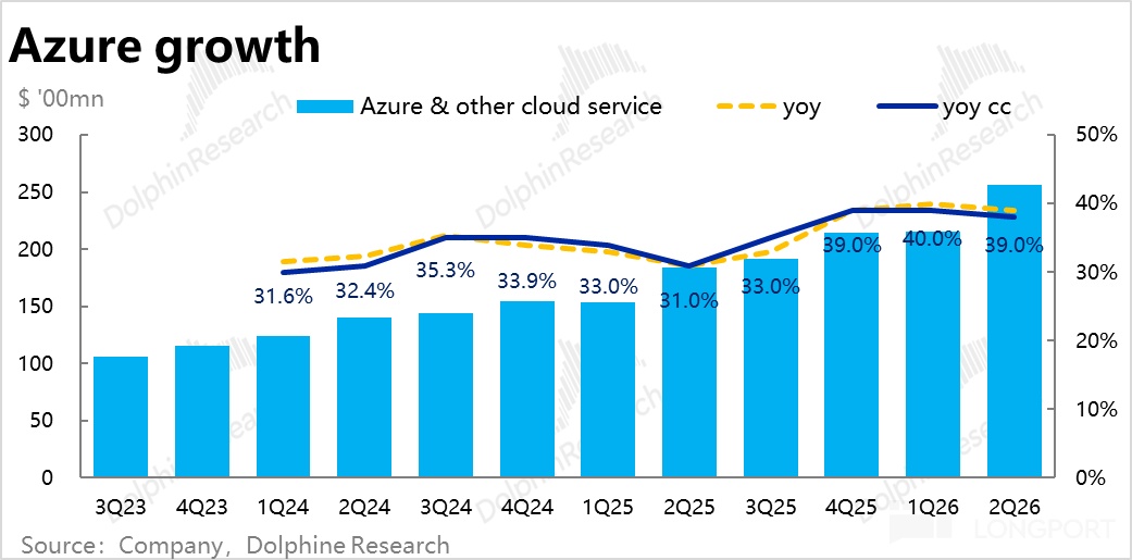 首先市场最关注的业务,Azure 本季营收同比增长 39%,剔汇率影响后增速则为 38%,两者都较上季有 1pct 的降速。虽然仍高于公司自己指引的 37%,但实际卖方预期在 39%、买方可能更高。因此实际表现是跑输市场预期的