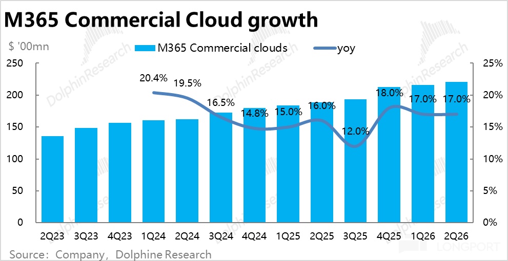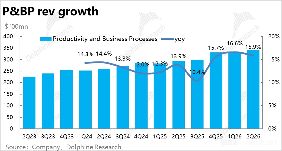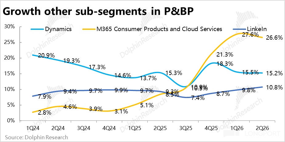 整体上,在核心商用 M365 业务增长平稳,其他各板块加速或放缓幅度也都不大的情况下,本季生产力流程板块的整体的营收$341 亿、增速为 15.9%,较上季只是略有降速,依然小超卖方一致预期和公司此前指引($333~336 亿)。
