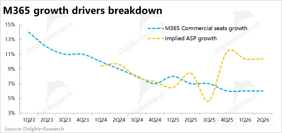 从量价角度来看,1)本季商用 M365 的订阅坐席数量同比增加 6%,和上季度持平;2)因此,隐含平均客单价的同比涨幅也大体维持在 10% 左右。