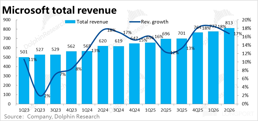 汇总上述各板块表现,微软集团整体本季度营收$813 亿,同比增长 17%,略高于卖方一致预期 1.2%。
