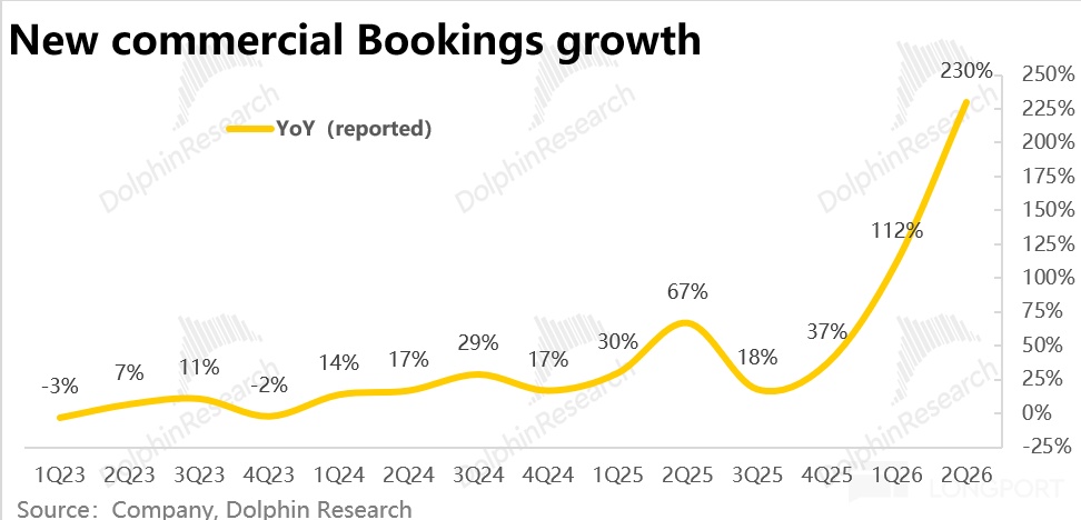 相比平淡的当季收入增长,本季公布的领先指标乍看之下相当炸裂。具体来看,本季新签企业合同金额同比暴涨 230%,在上季度时已相当夸张的 112% 的基础上再度翻倍。类似的,待履约企业合同余额本季也环比暴增约$2330 亿,达到$6250 亿