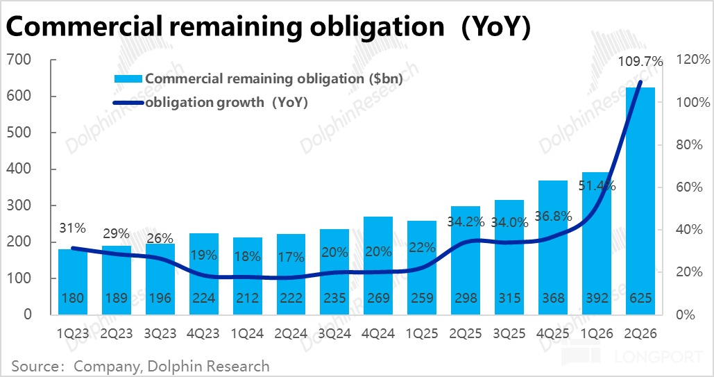 上次业绩时,海豚君就已提及,在 10 月份在重新商定了与微软的合作关系后,OpenAI 依然向 Azure 签订了合计约$2500 亿使用承诺合同,这反应到了本季财报中。此外,先前微软和 Anthropic 宣布的合作(约 300 亿美金)也有贡献。