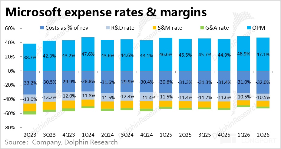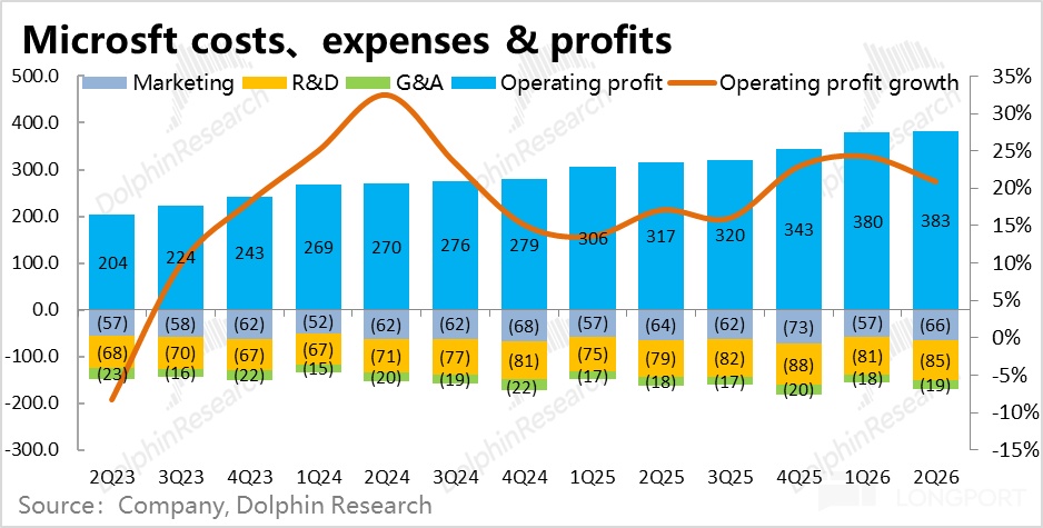 b. 费用角度,微软本季的营销、研发和管理费用三费合计同比增长仅 5.4%远低于营收和毛利润都在 15% 以上的增速。因此虽然真实收入增速在放缓,毛利率也承压下降,但在良好的控费下,经营利润率仍同比走高了 1.6pct