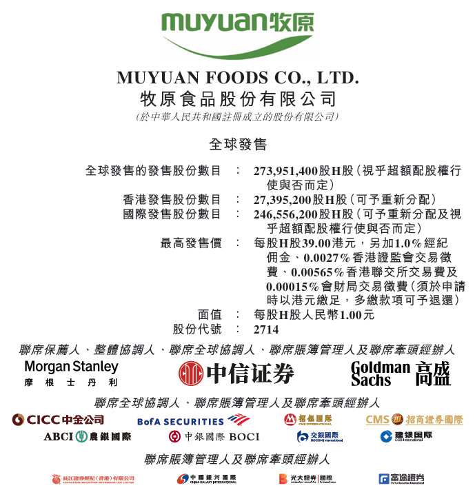 牧原食品股份有限公司(02714.HK)于2026年1月29日正式启动H股招股,招股价为每股不高于39.00港元,每手100股,入场费3,939.34港元,预计于2026年2月6日在港交所主板挂牌上市。本次拟全球发售2.74亿股,最高募集资金约106.8亿港元。