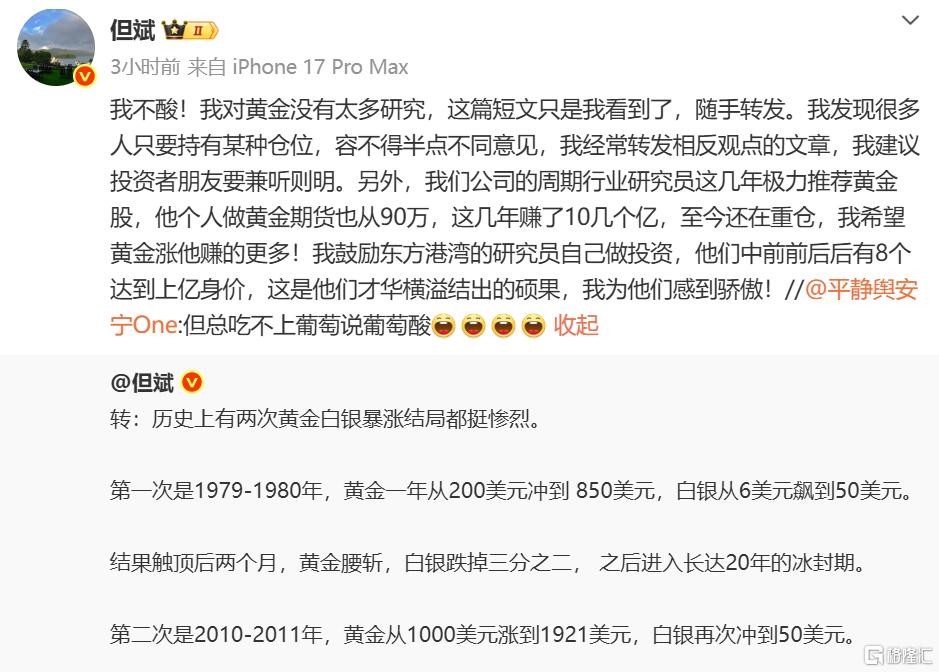但斌此时转发了一篇分析“历史上黄金白银暴涨后惨烈结局”的短文,被网友反击:“吃不上葡萄说葡萄酸。”