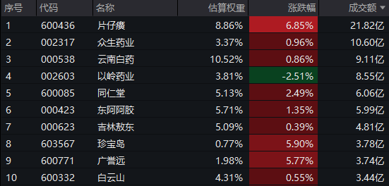 中药ETF(560080)标的指数热门成分股多数收红:片仔癀涨近7%结束九连跌,珍宝岛、广誉远涨超5%,同仁堂涨超2%,东阿阿胶涨超1%,众生药业、云南白药涨近1%。