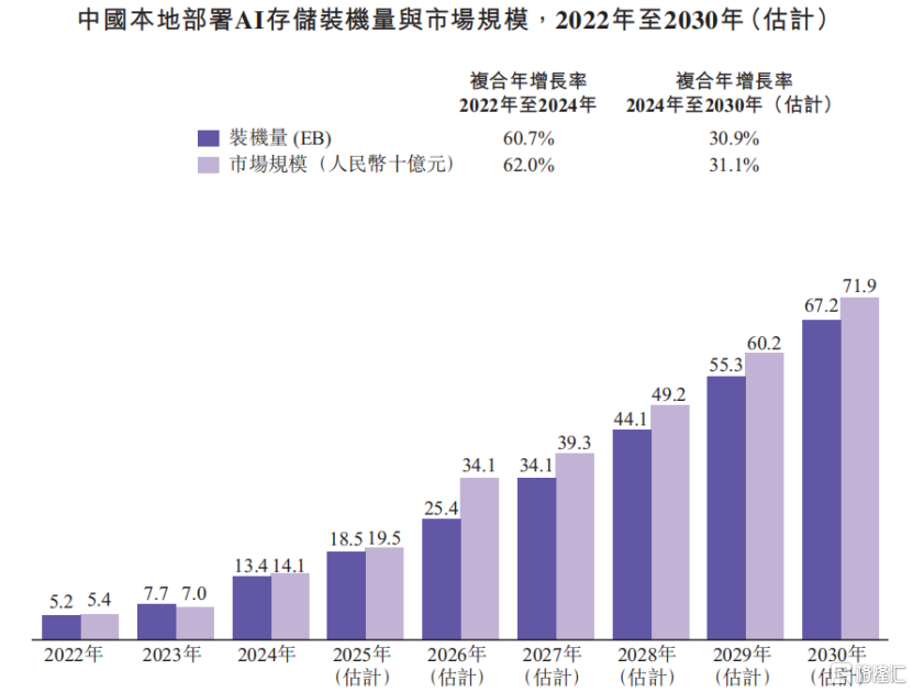 根据灼识咨询的资料,中国本地部署AI存储装机量在2024年达到13.4EB,并预计在2030年扩大至67.2EB,复合年增长率为30.9%。