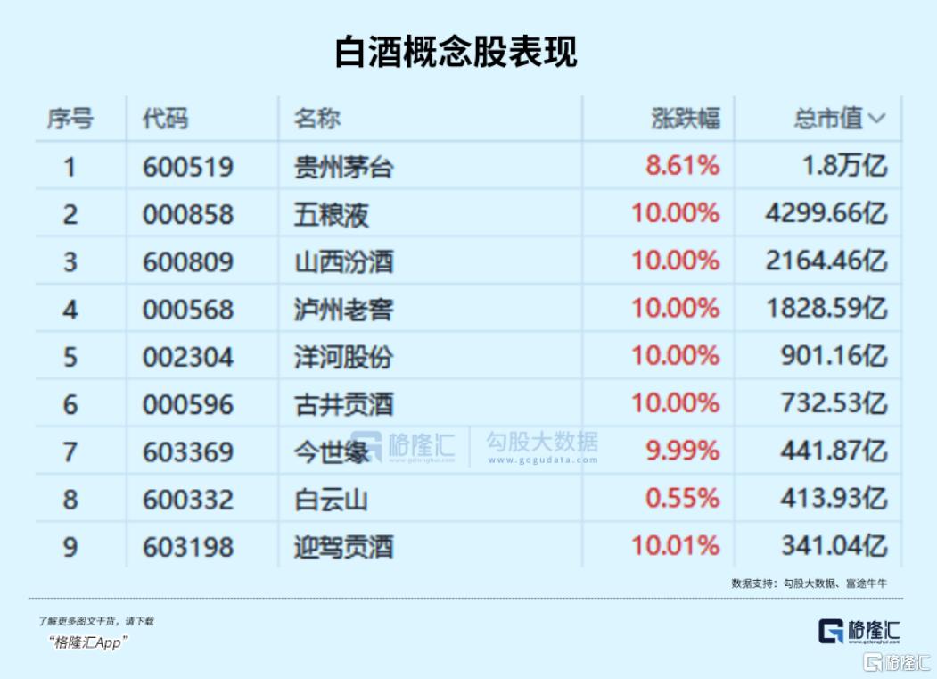 白酒股午后突然拉升,贵州茅台涨超8%,五粮液、山西汾酒、泸州老窖纷纷涨停。