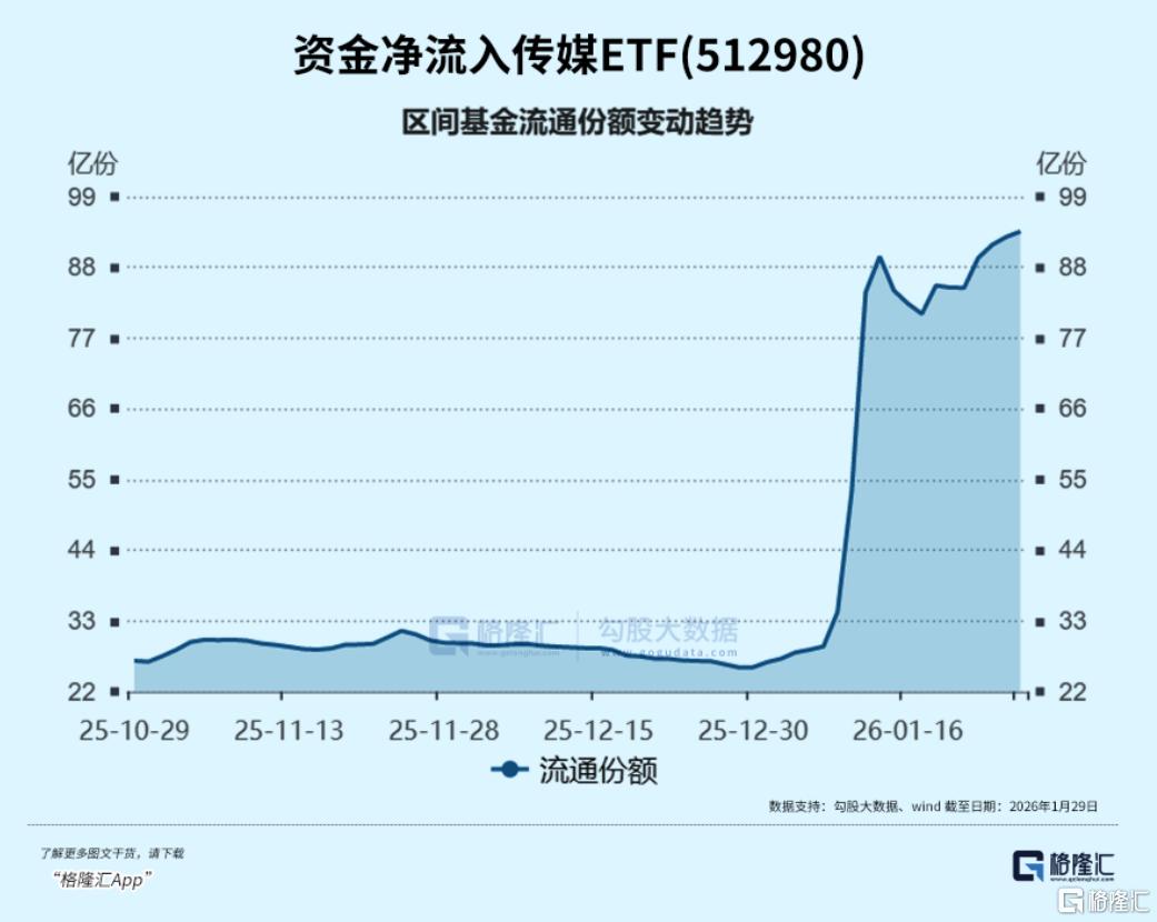 春节临近,加上近期AI应用催化频频,资金对传媒领域的关注快速增长。传媒ETF(512980)近5日资金净流入10.45亿元,近20日资金净流入85.66亿元,最新规模突破百亿达110.2亿元,成为全市场首只百亿级别的传媒主题指数基金。