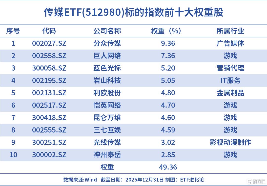 传媒ETF(512980)及联接(A:004752;C:004753)跟踪中证传媒指数,指数覆盖分众传媒、易点天下、利欧股份等GEO概念股,GEO权重占比超32%。