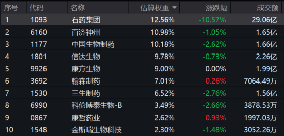 港股通创新药ETF(159570)标的指数热门股多数飘绿:石药集团利好落地跌超10%,中国生物制药、三生制药、科伦博泰生物-B跌超2%,百济神州、金斯瑞生物科技跌超1%,信达生物微跌。