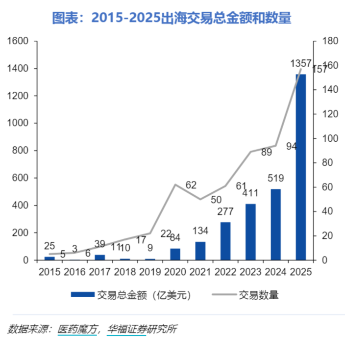 1、出海交易创纪录:2025年BD出海交易总额超1350亿美元,首付款70亿美元,单笔交易均价从6亿提升至9亿美元。