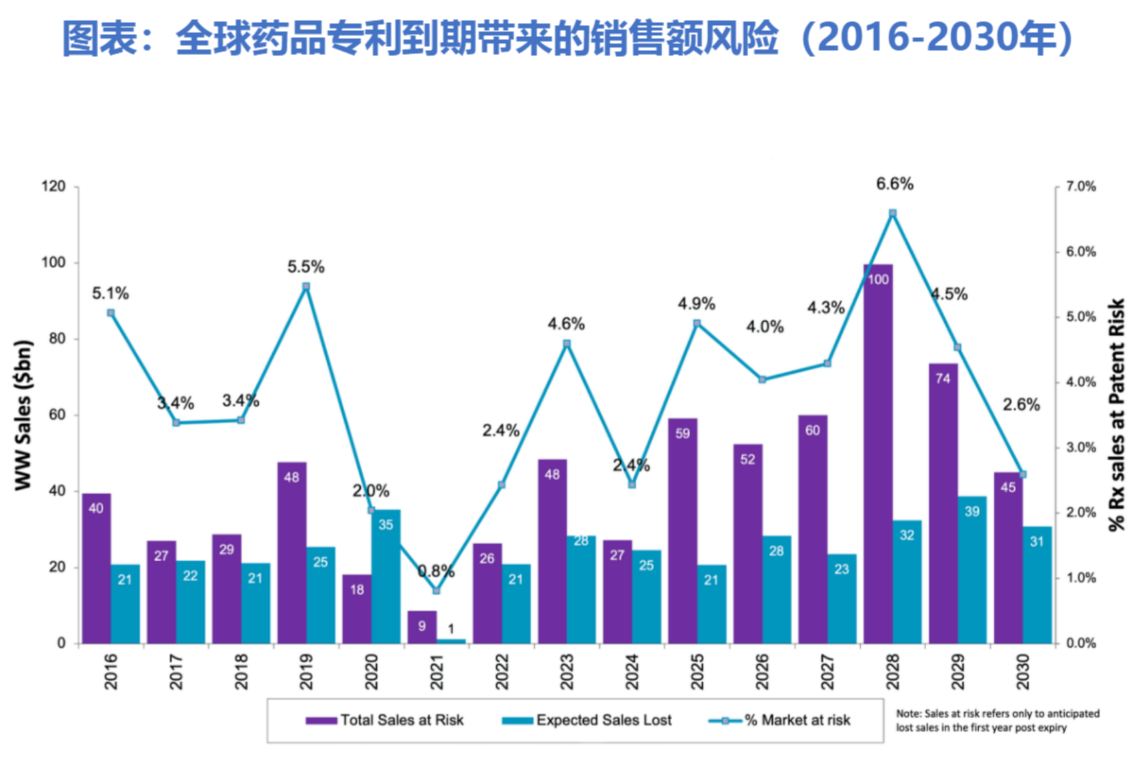 2025年下半年标普生物科技指数从底部上涨50% ,降息预期推动资金从科技股流向生物科技板块,礼来市值突破万亿美元。美股Biotech涨幅前十的公司(如ABIVAX、CELCUITY)多因创新管线关键数据成功驱动。2027-2028年Keytruda、Opdivo等重磅药物专利到期,全球面临风险销售额峰值约1000亿美元。