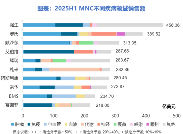 面临专利悬崖,MNC通过并购/BD补充管线。MNC战略聚焦肿瘤与免疫,延伸至神经、代谢领域,各专所长分域深耕。肿瘤领域以IO ADC为核心,多家MNC通过自研与BD快速入局代谢。