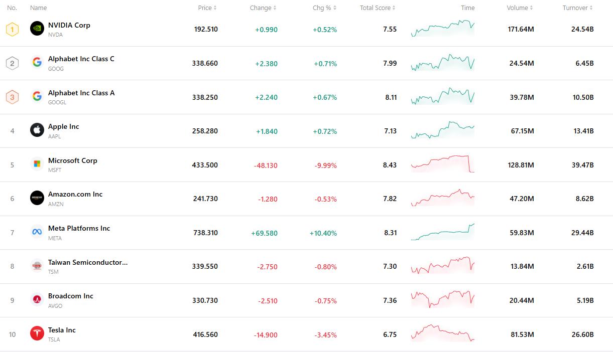下图列出了当前市场中成交最为活跃的十只个股。凭借极高的成交量和流动性,这些标的已成为观察全球市场动态的重要风向标。