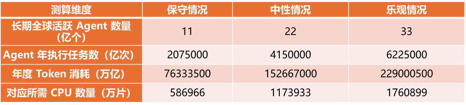【不同假设下2030年全球 Agent 发展对应所需 CPU 数量测算表】