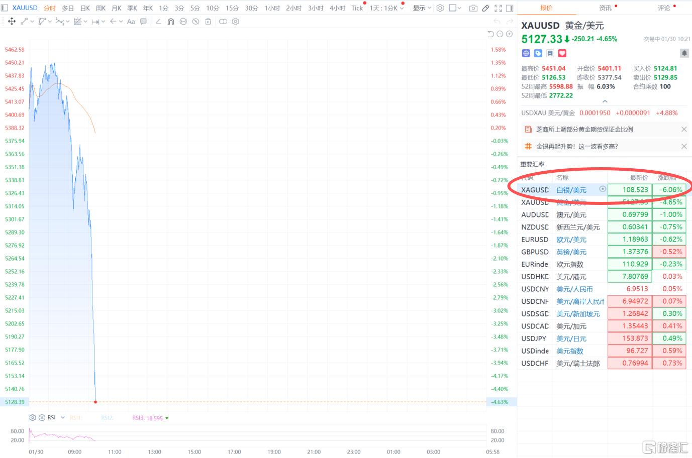 现货白银跌势更猛,盘中一度失守108美元/盎司;现暴跌超6%%,报108.523美元/盎司。