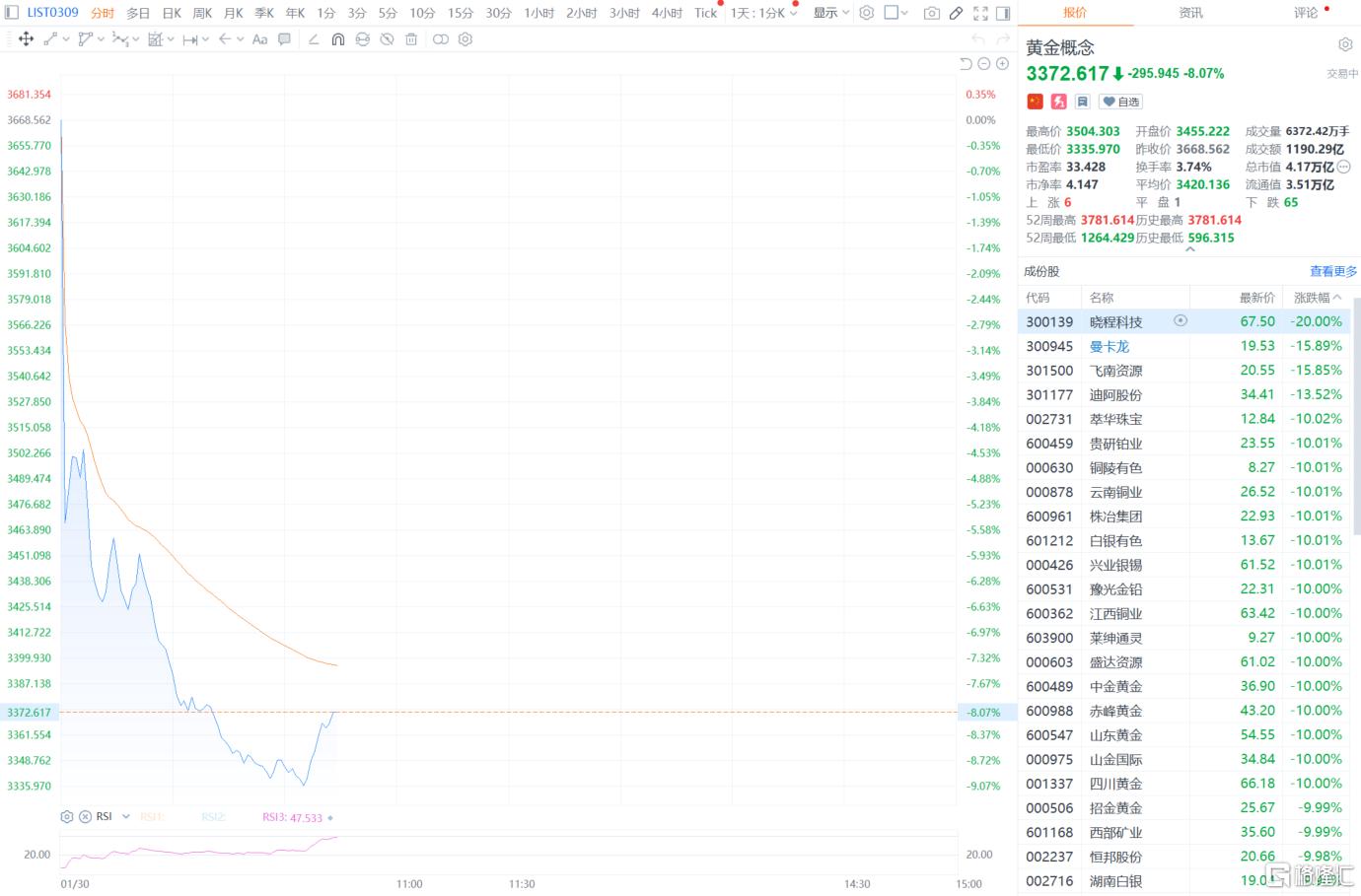 A股黄金股大面积跌停,晓程科技、萃华珠宝、铜陵有色、江西铜业、白银有色、中金黄金、赤峰黄金、莱绅通灵、四川黄金、招金黄金等多股跌停。