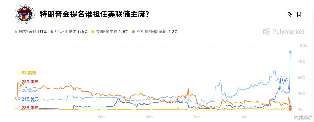 Polymarket最新预测显示,沃什被提名的概率已经飙升至91%。