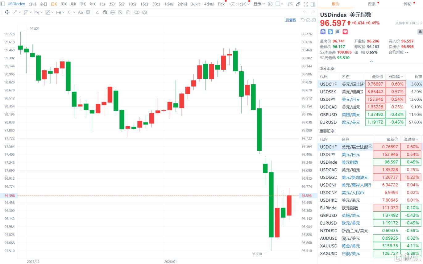 截至发稿,美元指数涨幅扩大至近0.5%报96.597,美元对日元上涨超0.5%至153.946。