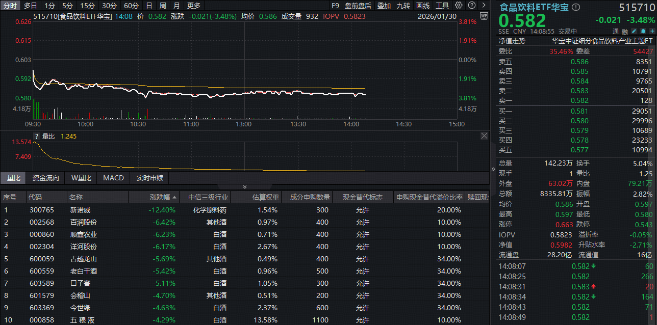 吃喝板块今日(1月30日)回调。反映吃喝板块整体走势的食品饮料ETF华宝(515710开盘后迅速走弱,而后持续低位震荡,截至发稿,场内价格跌3.48%。