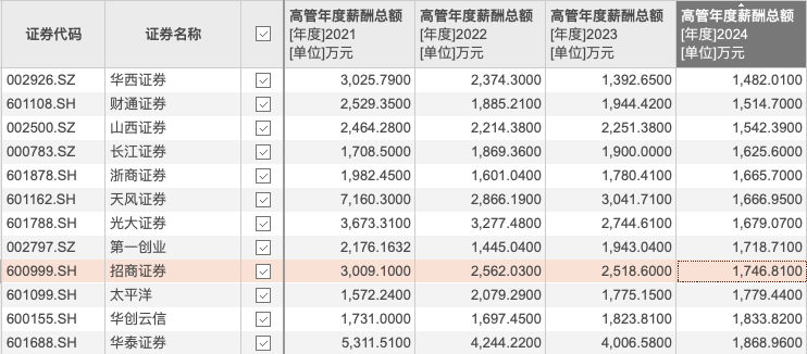 其次,招商证券的高管薪酬也呈现下降趋势。年报数据显示,招商证券董监高薪酬从2021年的3009.10万元降至2024年的1746.81万元。2025年上半年,该公司关键管理人员报酬为498.19万元,较上年同期的783.72万元下降了36.43%。