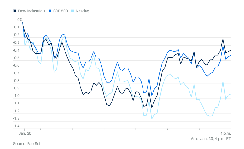 道琼斯工业平均指数周五以连续第三周下跌结束了一月,下跌约178点,跌幅为0.4%。标普500指数下跌0.4%,纳斯达克综合指数下跌0.9%。道指自2024年12月以来尚未出现连续三周收低的情况。尽管如此,由于年初的反弹,道指一月整体仍上涨。