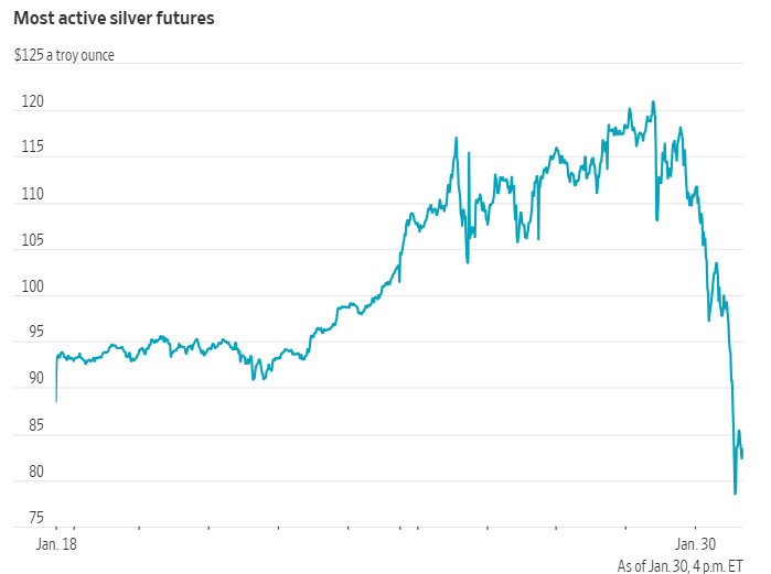 白银价格在周五跌破每金衡盎司80美元,而就在一周前,白银价格才首次突破每盎司100美元。交易最活跃的白银期货周五暴跌31%,是自1980年3月以来最大单日跌幅,收于每盎司78.53美元。