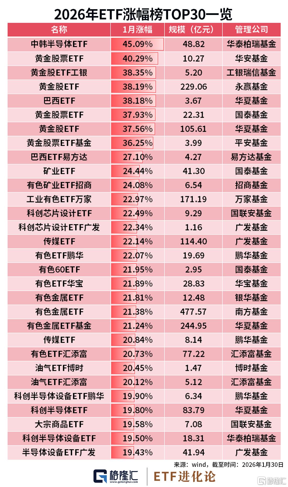 从板块来看,有色金属与科技两大主线交替领涨。1月,中韩半导体ETF、黄金股票ETF涨超40%,巴西ETF涨超38%,矿业ETF、有色金属ETF、科创芯片设计ETF等涨超20%。