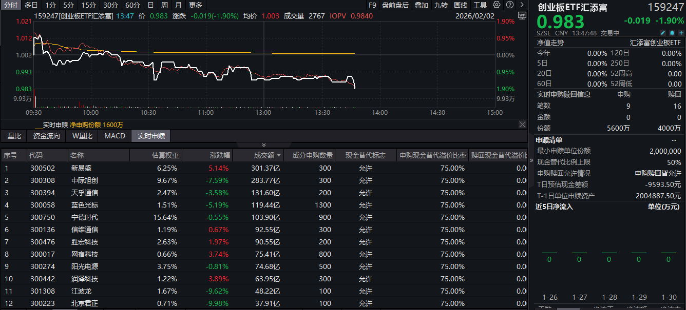 受“易中天”业绩催化,算力板块早盘冲高后回落。今日上市的创业板ETF汇添富(159247)跌近2%,盘中成交额已超1亿元。资金面上,盘中获净申购1600万份!热门成分股涨跌互现:新易盛涨超6%,网宿科技涨超3%;中际旭创跌超6%,天孚通信跌超2%。(标的指数成分股仅做展示,不作为个股推介)