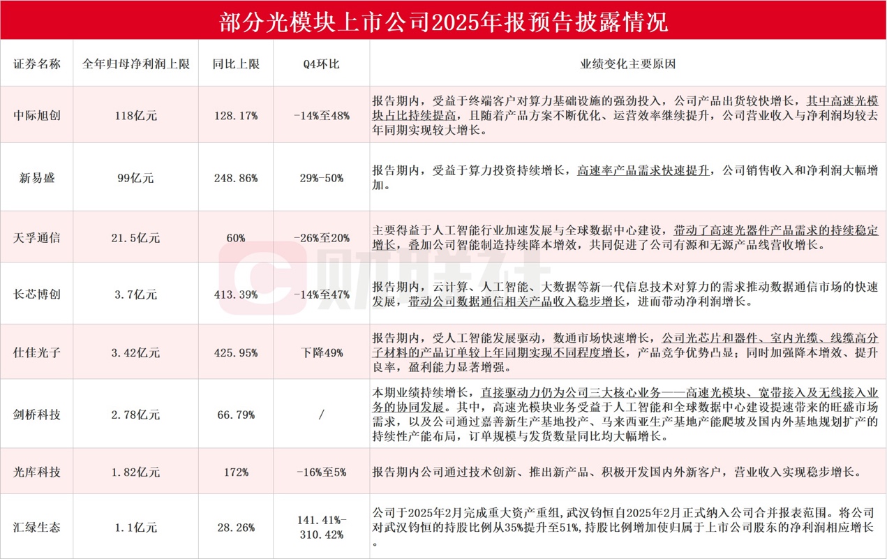 消息面上,截至2月1日,包括中际旭创、新易盛、天孚通信、长芯博创、仕佳光子、剑桥科技、光库科技和汇绿生态在内的多家光模块上市公司披露2025年度业绩预告。其中,中际旭创2025年净利同比预增89.50%-128.17%;新易盛Q4净利预计环比增长29%-50%。
