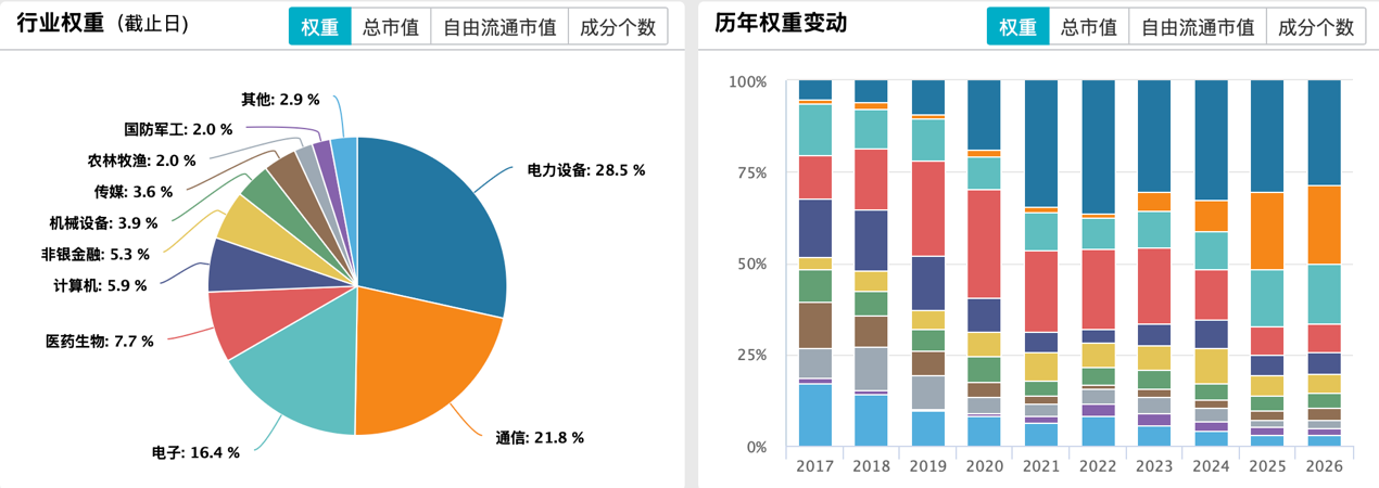 从行业分布来看,创业板ETF汇添富(159247)标的指数集中于电力设备(29%)、通信(22%)、电子(16%)、医药生物(8%)、计算机(6%)、非银金融(5%)等。创业板指的行业分布随行业升级不断迭代进化。2017年以来,随着医药行业快速发展,医药生物行业占比快速提升;近年来随着光伏、新能源车、AI产业链的爆发,电力设备、通信、电子行业占比显著提升。