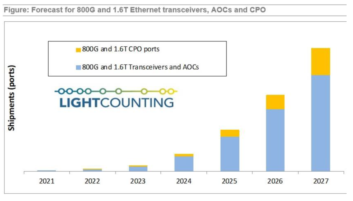 伴随未来人工智能的发展,数据通信光学器件2022-2028增速CAGR将为24%,2028-2033为80%。到2027年,CPO端口将占总800G和1.6T端口的近30%,这主要受益于:1)AI 集群和HPC的架构正在不断演进发,2)超大规模数据中心的计算集群。