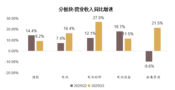 从需求端看,锂电池需求将维持高速增长,受益于持续旺盛的下游需求,预计25年及26年锂电池整体装机需求仍可维持20%-30%增速。从供给端看,电池环节供需结构改善,开启涨价通道。上游材料产能利用率提升,六氟磷酸锂(6F)、铁锂正极、负极等环节价格修复。从盈利端看,行业营收及净利润全面改善,业绩拐点已现。分板块观察,储能、电池、电池设备等环节基本面表现亮眼,2025Q3营收及归母净利润实现环比高增。