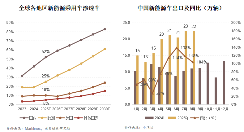 国内单车带电量持续提升,新能源商用车快速起量,8月新能源重卡销量同比增速达181%。海外市场需求持续旺盛,打开出口增量空间。欧洲、新兴市场等电动化转型持续推进,根据东吴证券预测,2025年全球新能源车需求增速可达21%,2026年增速16%出口空间广阔:当前海外市场新能源车渗透率仍处于较低水平,欧洲和美国分别仅有25%、10%,远低于中国的52%,仍有较大电动化转型空间。