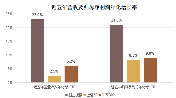 2、高成长:近五年,创业板指成份股营业收入年化增长率达23.0%、归母净利润年化增长率达21.0%,显著优于上证50、沪深300等宽基指数。