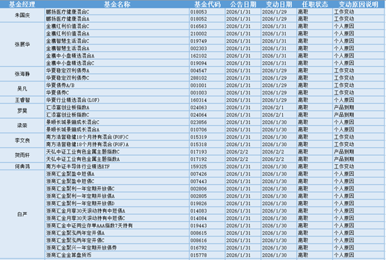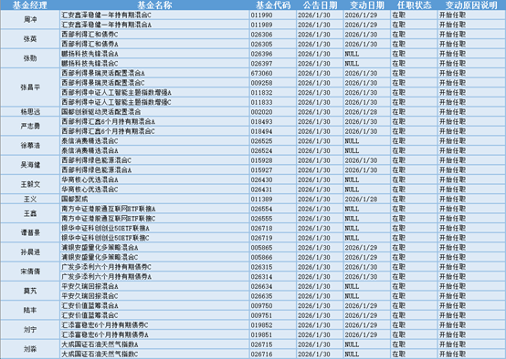 基金经理是一只基金产品最核心的成员,能决定一只基金的投资方向、投资策略以及投资风格,基金经理出色的择时选股能力和调研预测能力是基金业绩的有力保证,所以基金经理是投资者在选择基金产品时的重要依据。基金经理的变动很大程度上会影响到基金产品未来的表现,是一个需要特别关注的信息。1.31-2.2日共有36位基金经理发生任职变动。