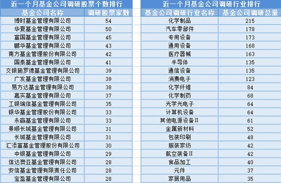 近一个月(1月3日-2月2日),博时基金参与公司调研的数量最多,共调研54家上市公司,此外调研较为活跃的还有华夏基金、富国基金和鹏华基金,分别调研50家、45家、43家上市公司;从调研行业上来看,基金公司对化学制品行业的上市公司调研次数最多,共有215次,其次是汽车零部件行业,基金公司调研了178次。
