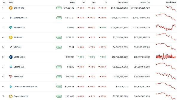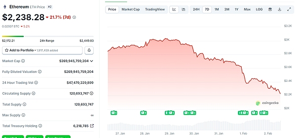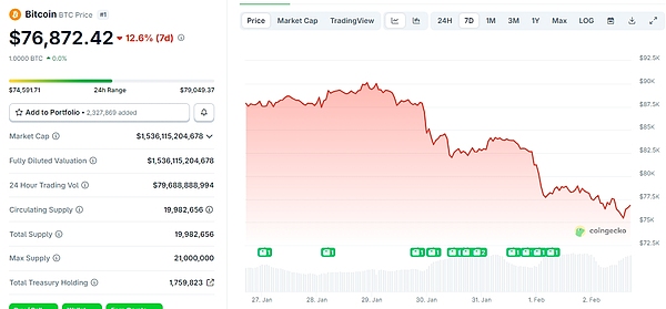 本轮暴跌则始于1月30日:BTC现跌势后,跌幅不断扩大,截至发稿,BTC已经跌破8万美元大关,勉强徘徊在7.5万美元关口以上。截至发稿,BTC报76872.42美元,7日跌幅12.6%;ETH报2238.28美元,7日跌幅21.7%。