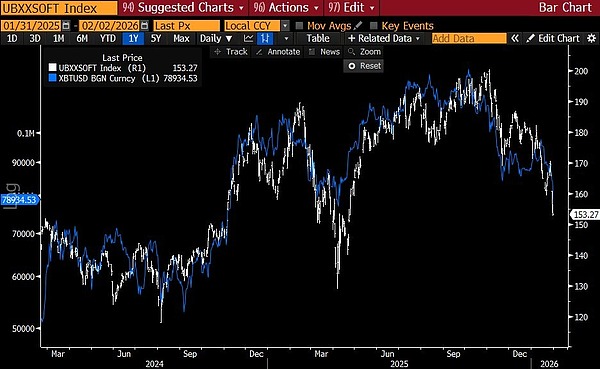 瑞银SaaS指数与比特币高度相关。来源:Raoul Pal