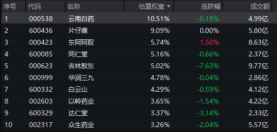 中药ETF(560080)标的指数权重股多数收绿:吉林敖东跌超7%,达仁堂跌超3%,众生药业跌超2%,以岭药业跌超1%,云南白药、同仁堂、华润三九、白云山微跌。上涨方面,东阿阿胶逆市涨超1%。
